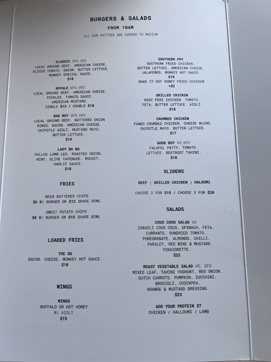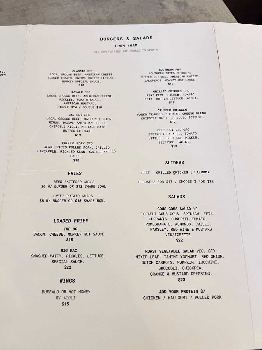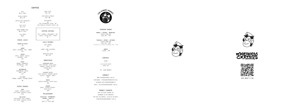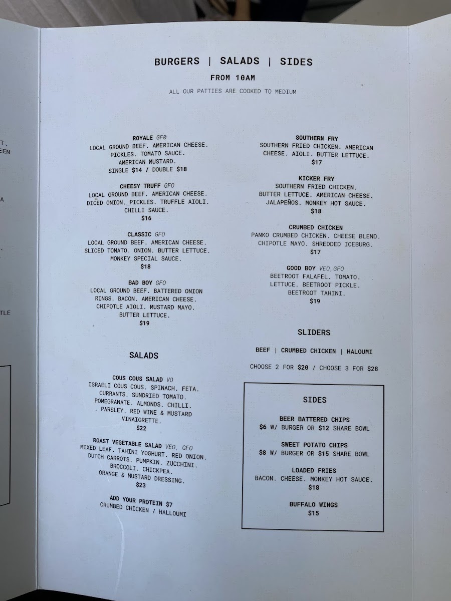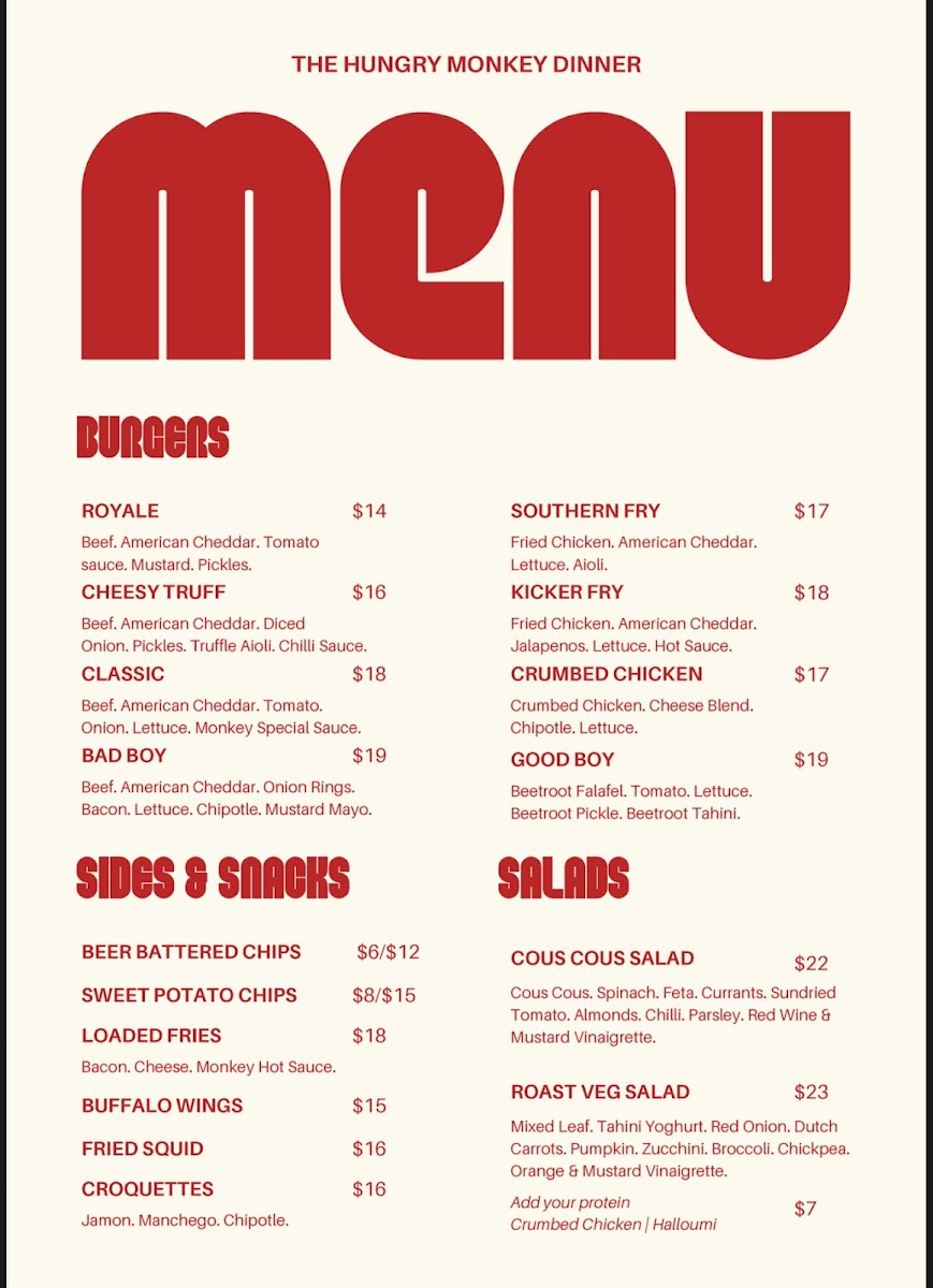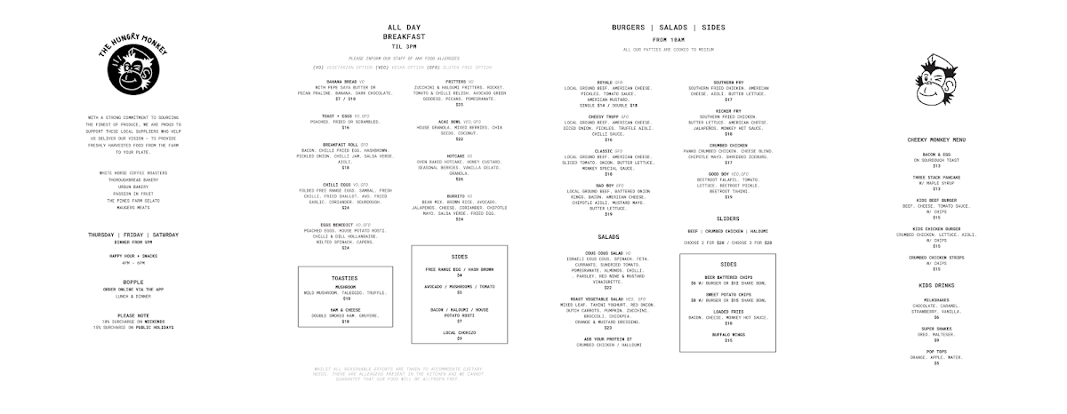 The Hungry Monkey Kiama offers a vibrant menu that masterfully blends hearty breakfast classics with inventive twists. Located in the heart of Kiama, this cozy cafe shines with its breakfast staples like the Bacon & Egg on Sourdough Toast and indulgent Three Stack Pancakes with Maple Syrup, both drawing rave reviews for their satisfying flavors and generous portions. Burgers take center stage here, with options ranging from the perfectly cooked Single Royale Burger to kid-friendly beef and chicken sliders, each paired with crispy chips. Sides like free-range eggs, hash browns, and house potato rosti add delightful texture and depth. The Hungry Monkey’s coffee and specialty drinks, including chai lattes and Nutella hot chocolates, are expertly crafted, enhancing the dining experience. Friendly service and a welcoming atmosphere make enjoying the fresh, locally-inspired fare here a true pleasure, ensuring it’s a must-visit spot for breakfast enthusiasts and burger lovers alike in Kiama.